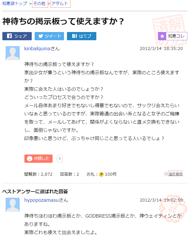 神待ち掲示板・神待ちサイトをヤフー知恵袋で自演ステマしまくられています